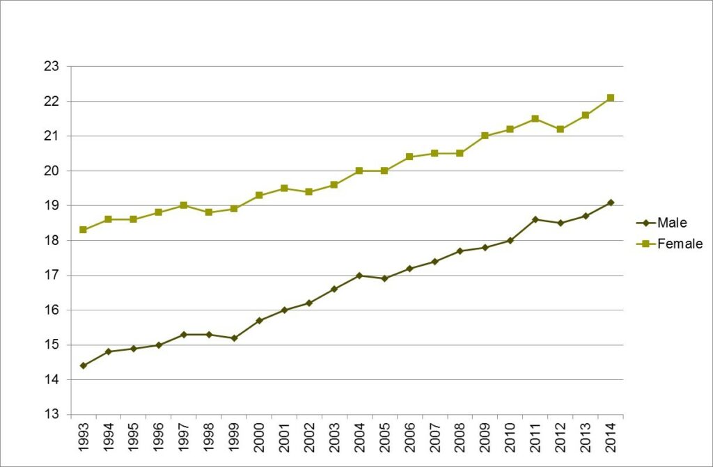 In this form the index clearly demonstrates how life expectancy in retirement has changed over time. It shows that life expectancy in retirement (measured from age 65) has increased from 14.4 years in 1993 to 19.1 years in 2014 for males and from 18.3 years in 1993 to 22.1 years in 2014 for females.