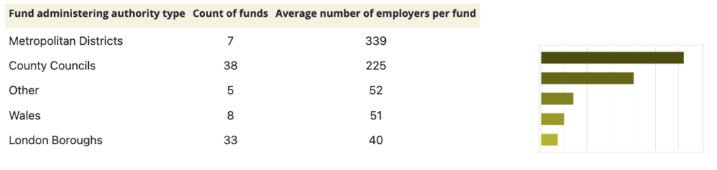 The chart shows how the average number of employers differs between the types of administering authority. County council administered funds typically have more participating employers compared with London boroughs. The ‘Other’ category comprises the London Pension Fund Authority, Transport Authorities and the Environment Agency funds.