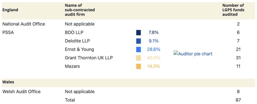 Each LGPS funds’ financial accounts are audited separately from each Local Authority financial accounts. They are then consolidated into Local Authority financial accounts and ultimately into the financial accounts of DCLG and HMT.
