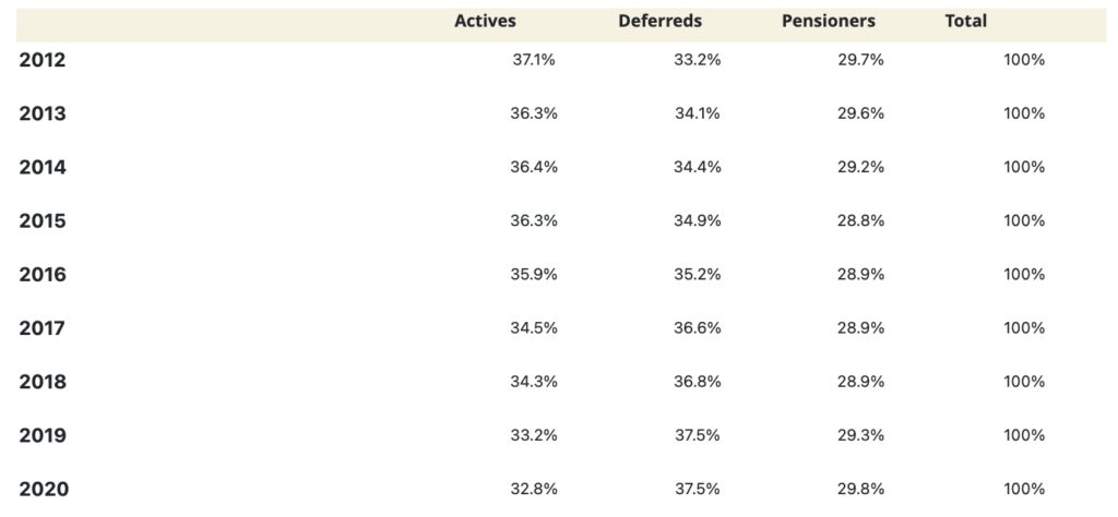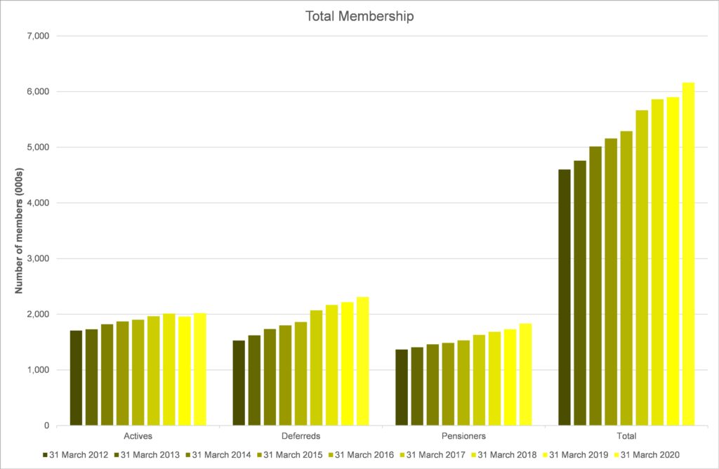 As at 31 March 2020, the total membership of the Scheme was 6.16million, compared with 5.89million as at 31 March 2019. The greatest increase in absolute and relative terms was to pensioner membership, which increased by 5.7% over the year to 2020.