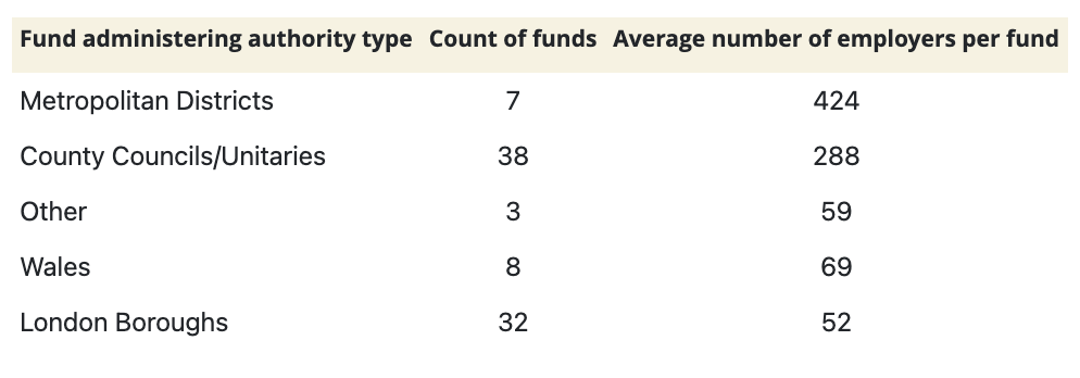 The chart shows how the average number of employers differs between the types of administering authority. County council administered funds typically have more participating employers compared with London boroughs. The ‘Other’ category comprises the London Pension Fund Authority and the Environment Agency funds (for the purpose of administration, City of London is included in London Boroughs).