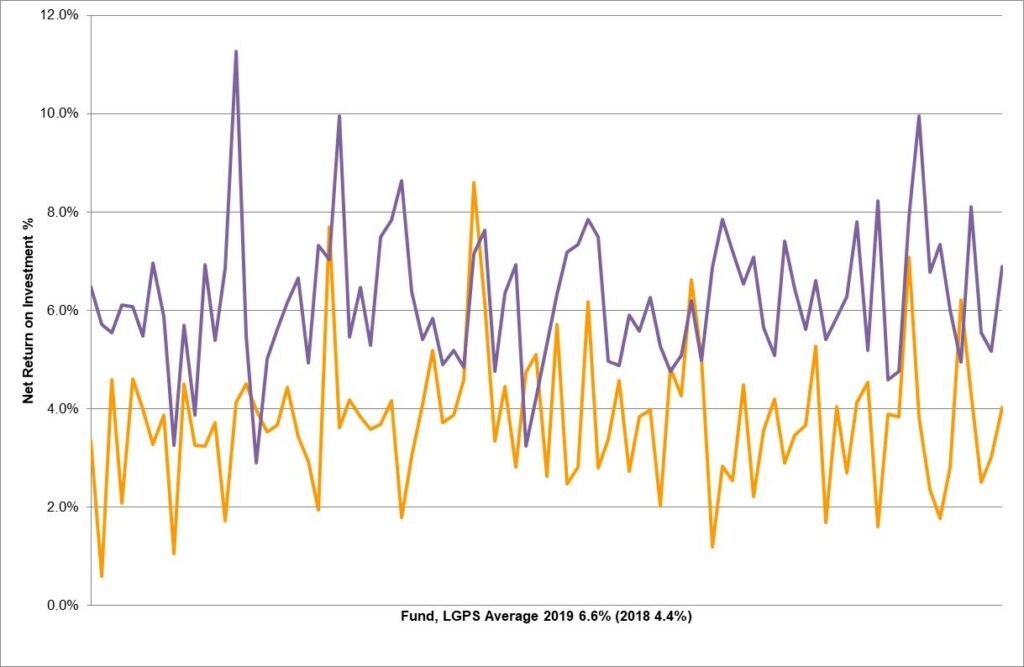 The above chart shows the distribution around 6.0%, for 2019 █, with most funds falling in a range of between 4.0% and 8.0%. For 2018 █ the distribution was around 4.0%, with most funds falling in a range of between 2.0% and 6.0%.